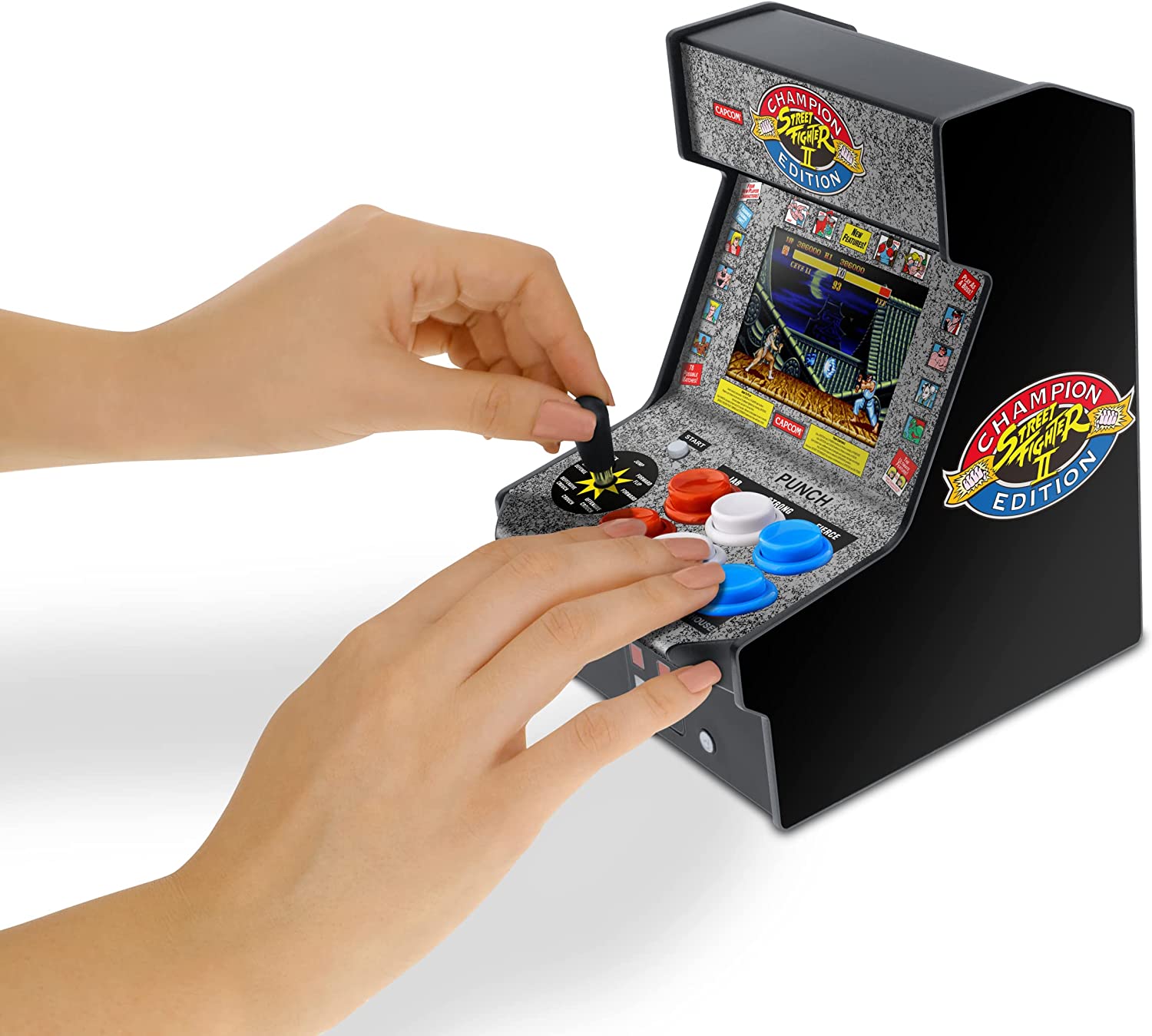 Twelve characters can now directly battle each other in 78 different possible match combinations and the ultimate feature, where characters must face their true equal...themselves. The legendary arcade classic Street Fighter II Champion Edition was released in 1992 and featured revolutionary game-play, including multi-button combinations and addictive head-to-head game-play. Returning for the first time as a fully playable mini-sized replica, it is a must have for casual fans and collectors of the legendary fighting game franchise.